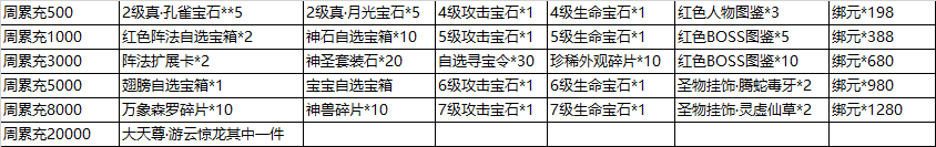 一、【每周累充】(活动开启时间后开始累计,单角色累计达到对应档位即可领取一次,可以向下覆盖,例如充值20000可领取全部档位的奖励。每周一0点额度重新累积)